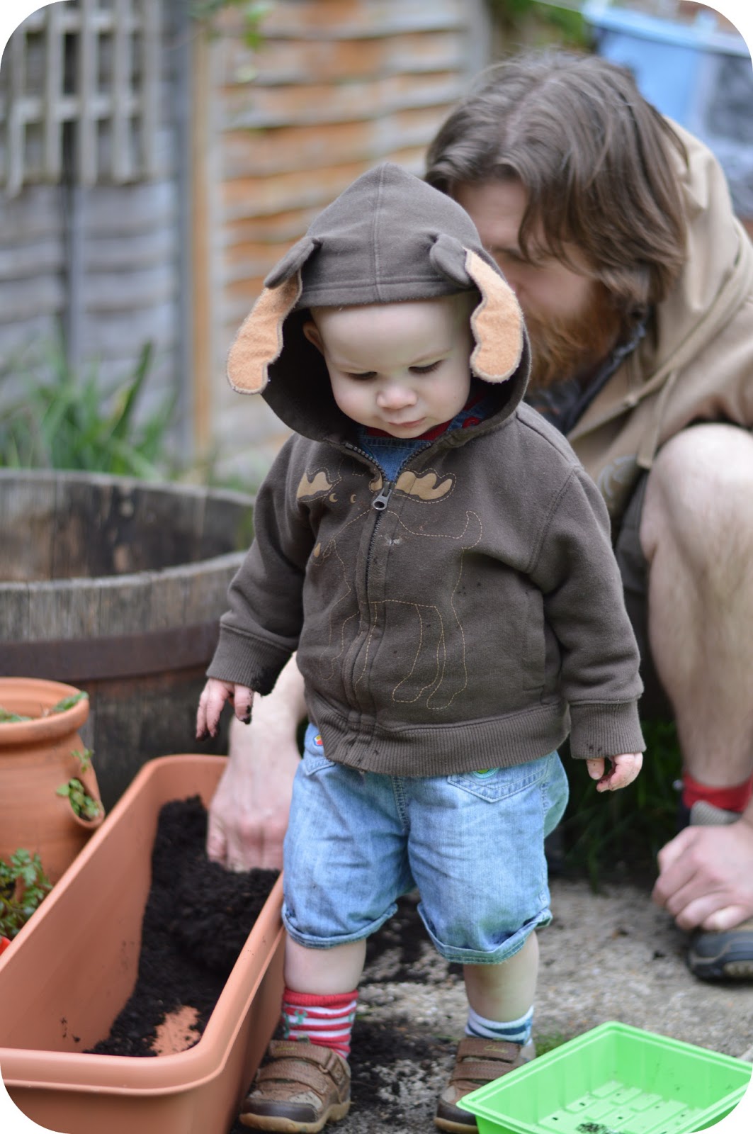 It is a well known fact that anything you grow yourself tastes better, especially when you’re little. After last year’s disasterously slow attempt (except for the pumpkins) coupled with the awful weather that we had, we’ve been quick off the mark this year…and everyone lent a hand. There are no Little Red Hens in this family.