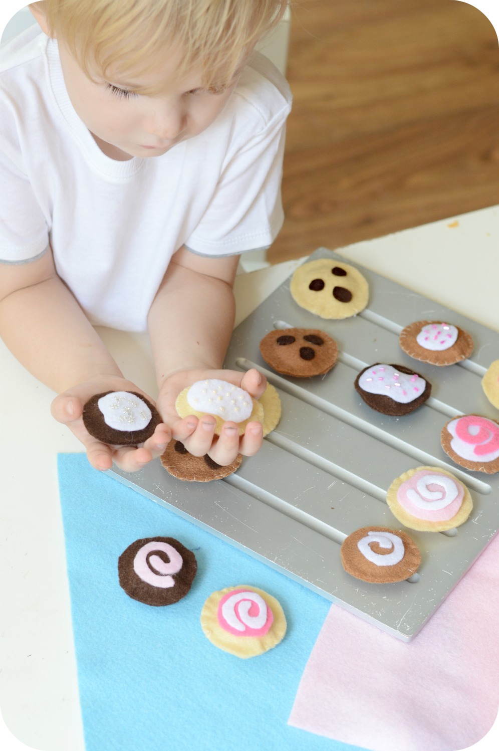 I know he’ll love the cookies. His face will explode with happiness as he instructs his little brother not to really eat the felty food and not to snatch them (because brother will, in true old fashioned cops and robbers style), and he’ll become the expert cafe owner as he places my creations ever so carefully into the bakery bags that his beloved Granny got from the shop because she knew he’d enjoy them.