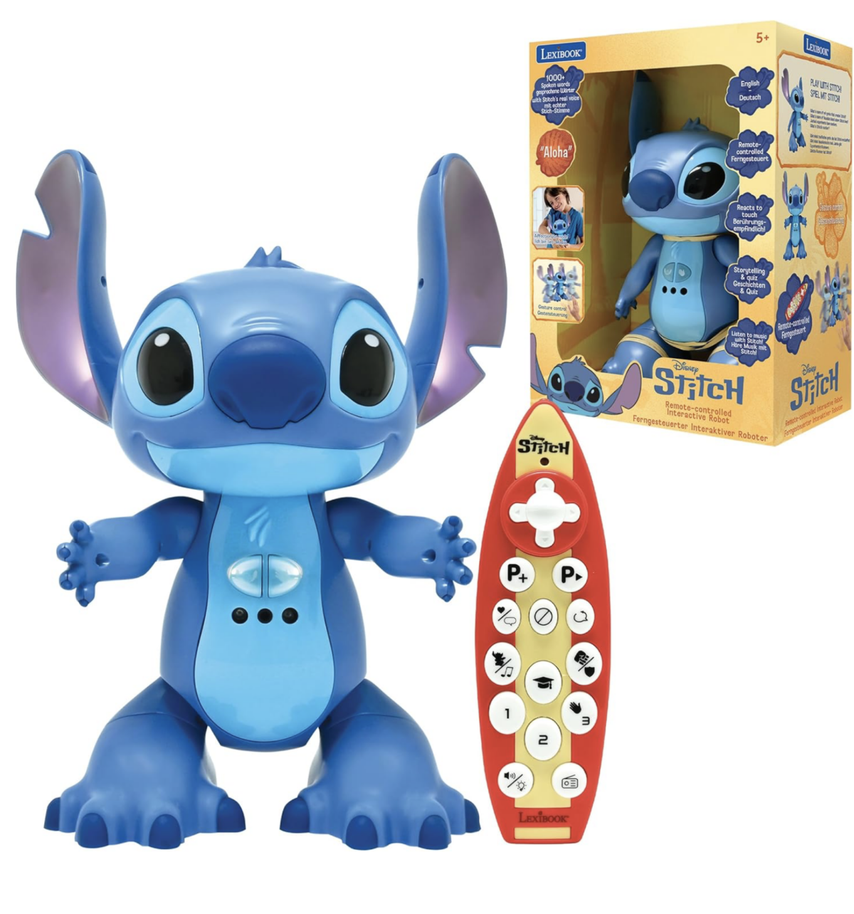 A Stitch that makes you smarter! Remote control Stitch reacts to your touch with dancing, singing and light effects whilst he teaches you about programming! You can control Stitch using the surf shaped remote control or gestures. He has two movement modes, walking and gliding.