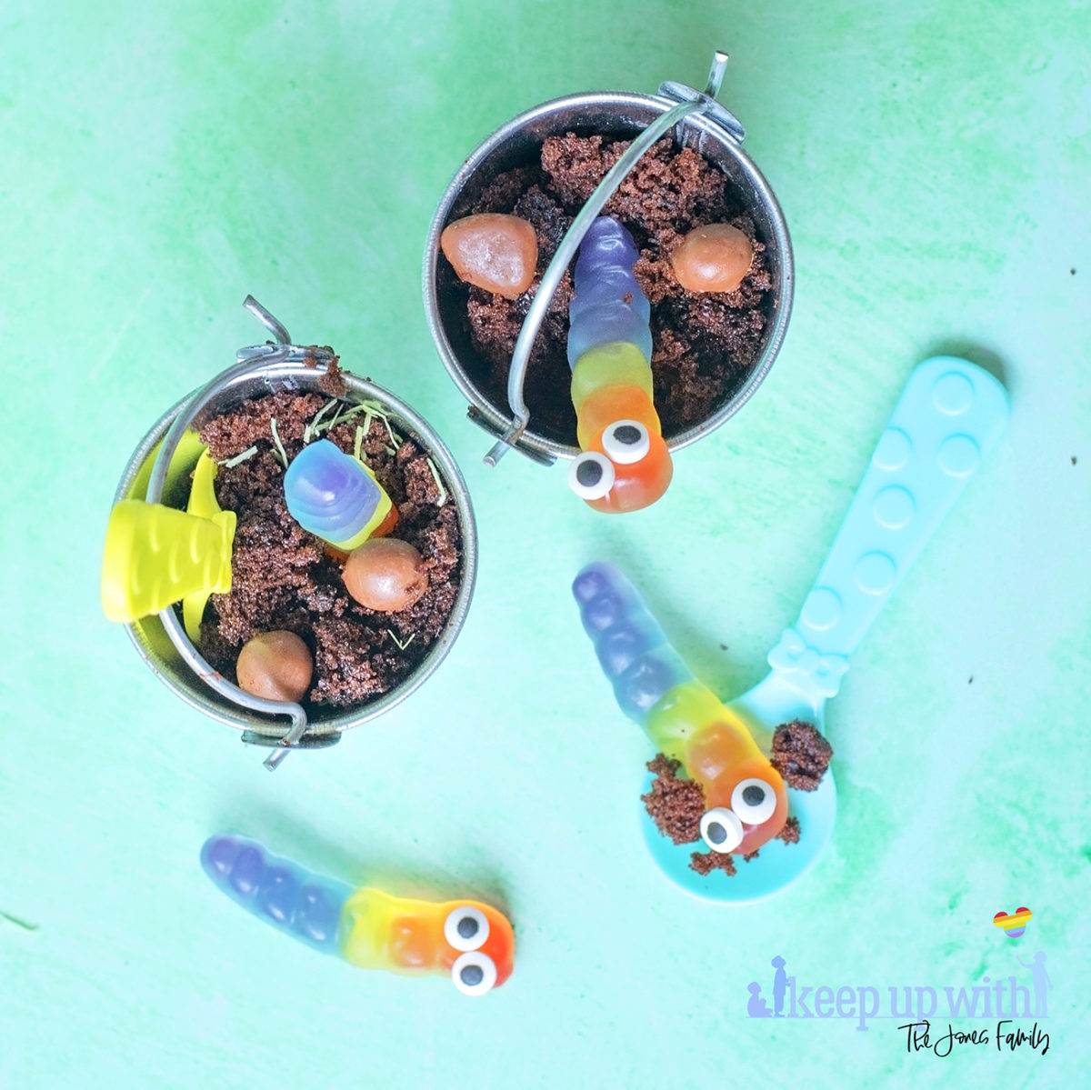 It’s so quick – I think the longest part was trying to get the eyes to stick to the gummy worms! Fluff up the cake and frosting together – you want it to be light and fluffy in the bucket, not all compacted. Pop some in each bucket, add the eyes to the gummy caterpillars and add them to the buckets, head or tail first. Sprinkle in some chocolate pebbles of your choice, and serve with a little spoon.