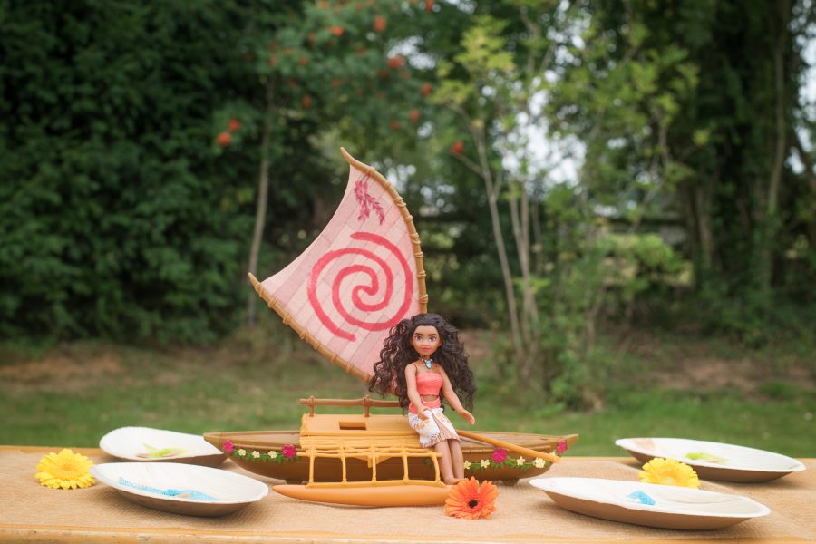 We were lucky to have big old wooden trestle tables that only needed a little bit of decorating – I popped to the florist and got a roll of the criss crossy flower wrapping fabric which is actually a tablecloth woven from coconut fibres [authentically Moana, you see] you can see in the photo for the food tables, and then for the actual party table I bought a couple of bunches of their tropical leaves and gerberas. They were around £5 for the leaves and around the same for the daisies, and covered a huge area. Moana sat on her boat in the middle and watched everyone wander around the buffet tables with her wayfinder plates, which were bamboo plates I got from a eco-store on the web.